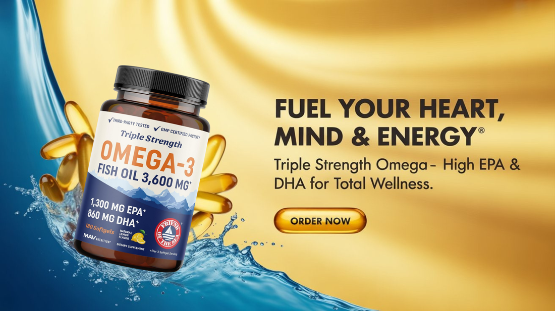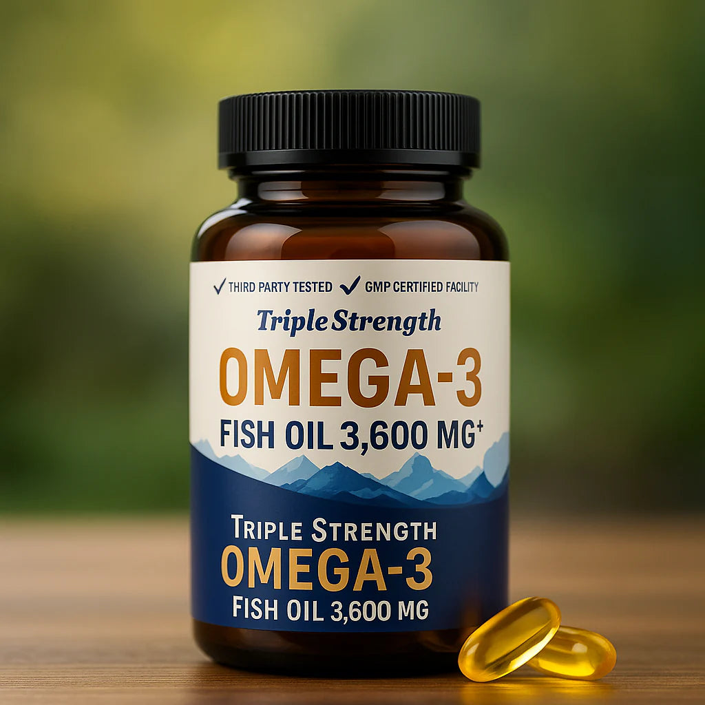 Our Triple Strength Omega-3 Fish Oil 3,600 mg delivers the essential support your body needs to feel stronger, sharper, and more energized every day. With a powerful blend of 1,300 mg EPA and 860 mg DHA, this formula promotes heart health, enhances brain function, reduces inflammation, and supports smooth joint movement—making it the perfect daily supplement for active lifestyles, gym users, and overall wellness. Made from premium wild-caught fish and refined for exceptional purity, each softgel is third-party tested, easy to digest, and completely burpless, ensuring you get clean, effective nutrition with every dose.